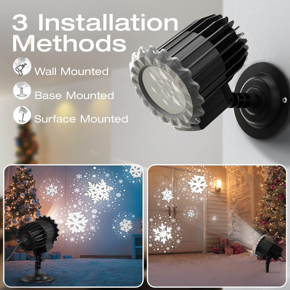 - 3 Flexible Installation Options: Snowflake projector lights includes complete kit with ground stake, flat base, and wall mount hardware. Install in minutes anywhere - secure in grass, place on tables, or mount on walls. Perfect for gardens, patios, and fireplace mantels