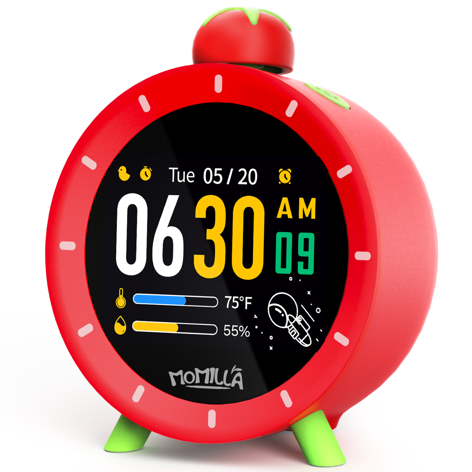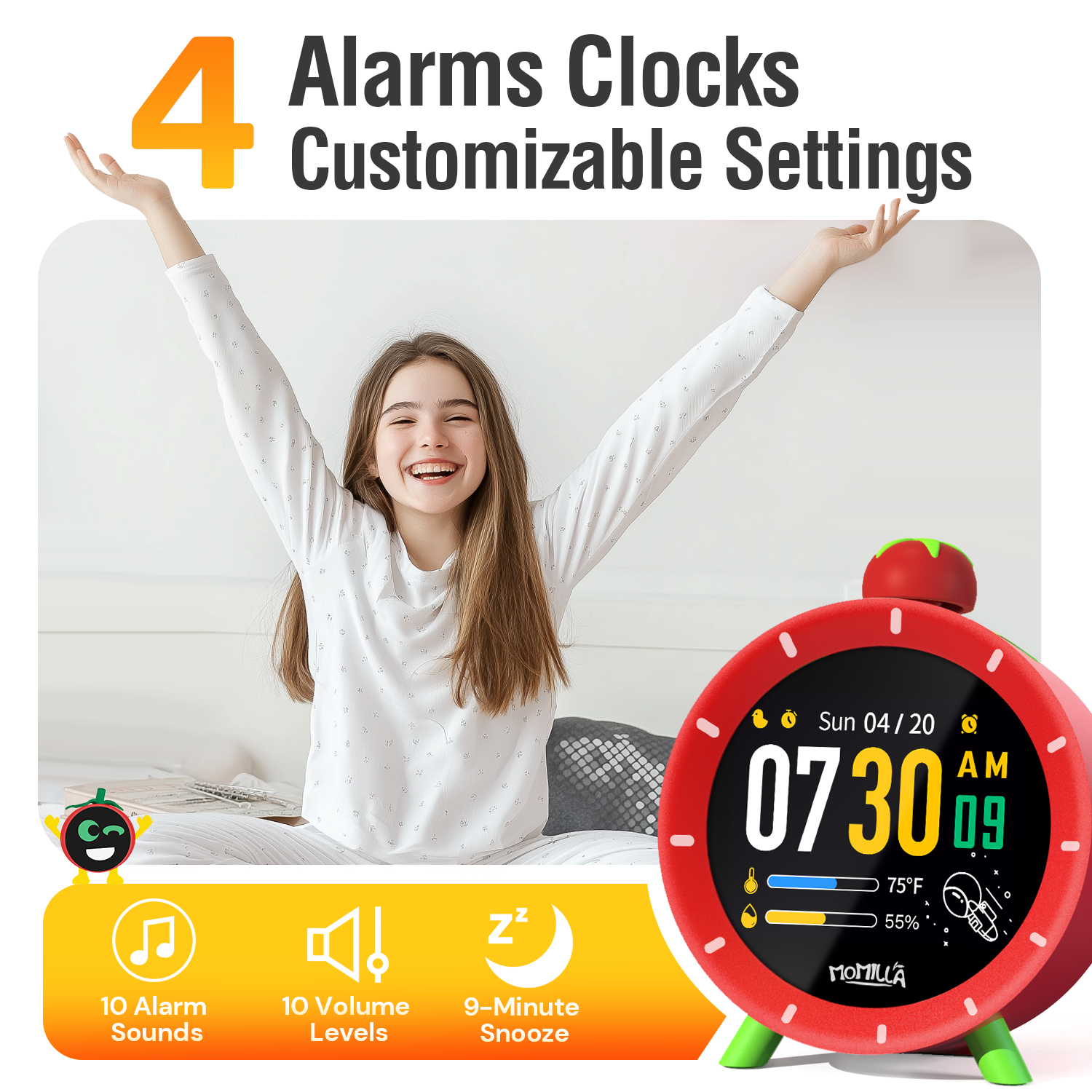 - 2-in-1 Kids Alarm Clock & Visual Timer: MOMILLA 4 alarm clock for heavy sleepers combines visual timer in one compact device. Featuring 6 vibrant color themes, the 2.8" LCD clearly displays time, date, day, and indoor temperature (°C/°F), with 10 brightness levels for easy viewing in any light.