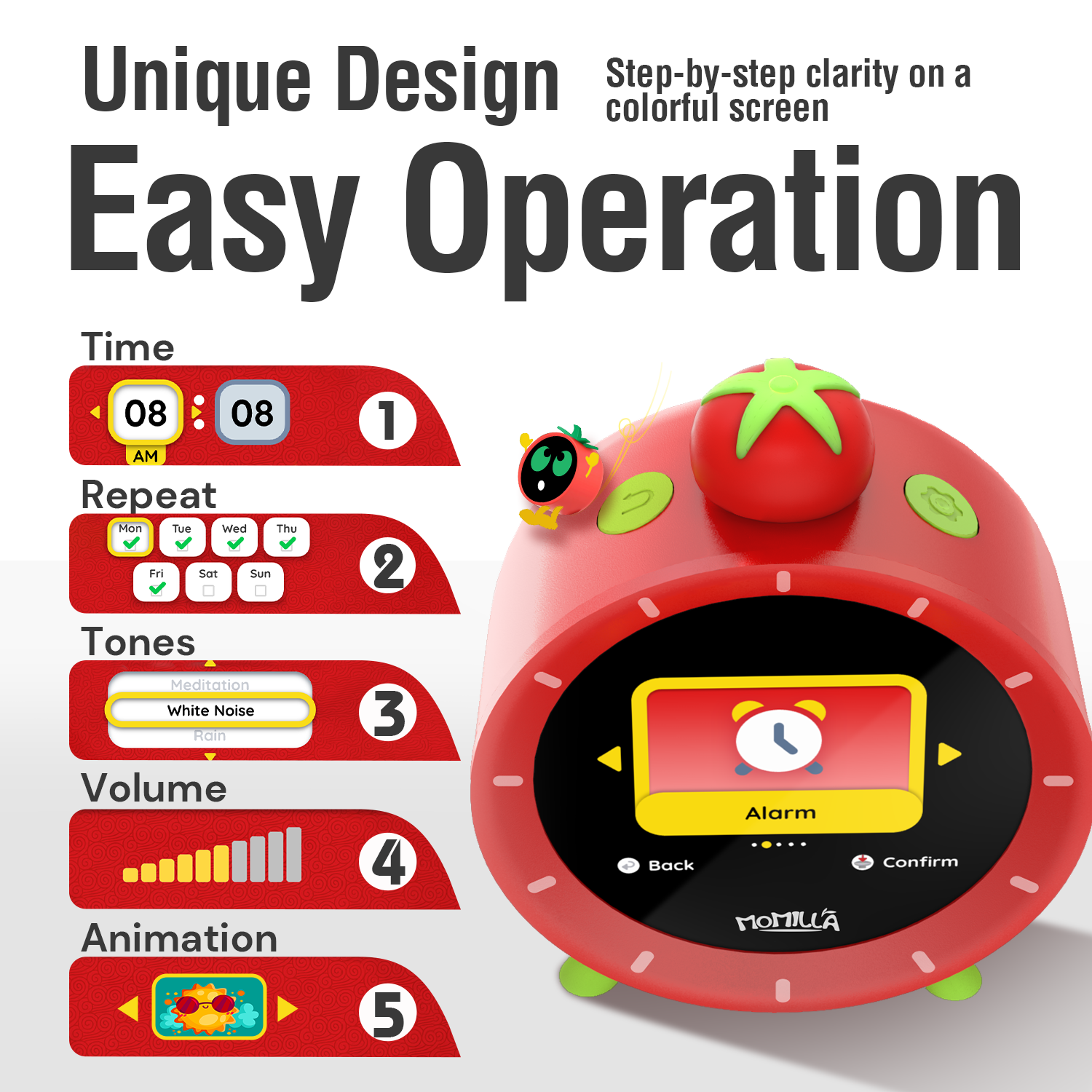 - Super Easy to Use: MOMILLA small cute alarm clock for kids (3.3" x 1.9" x 3.9") features just 2 buttons and a central knob for intuitive setup. One tap to enable the visual timer to manage the time. (Note: Requires power cord for use, but retains settings after unplugging) It is a great choice for Christmas birthday gifts for girls and boys.